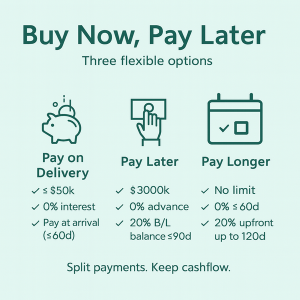 Need pricing, lead times (35–45 days), or BNPL details? Message me directly and I’ll help you place the order and pick the right terms.
