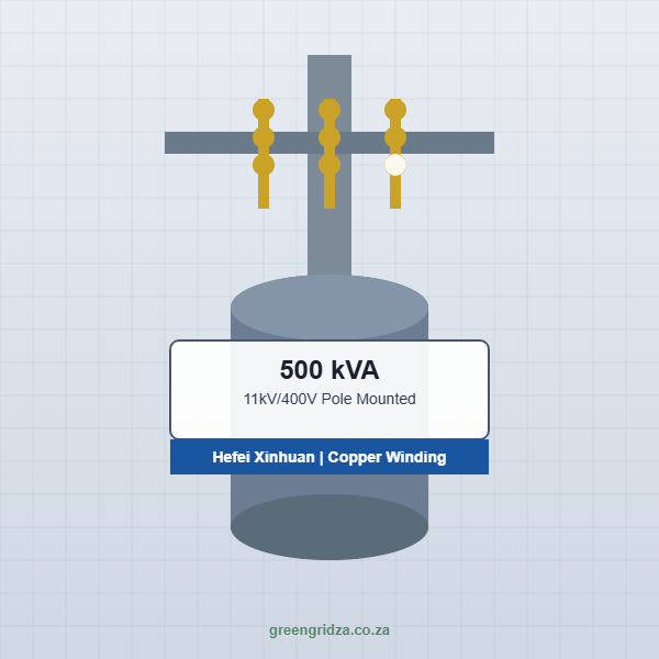 500kVA 11kV/400V pole mounted distribution transformer. Copper winding, manufactured by Hefei Xinhuan. High capacity pole-mounted transformer for heavy distribution loads. DDP Welkom delivery included.